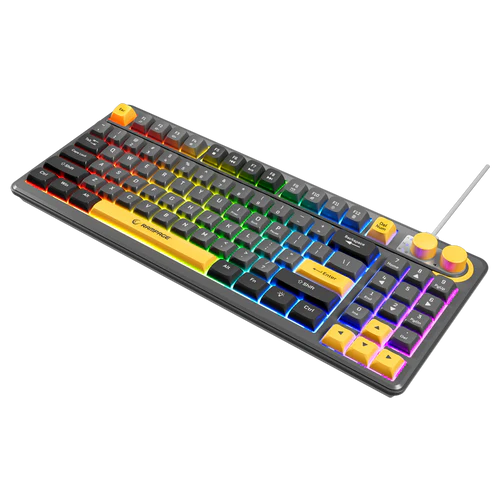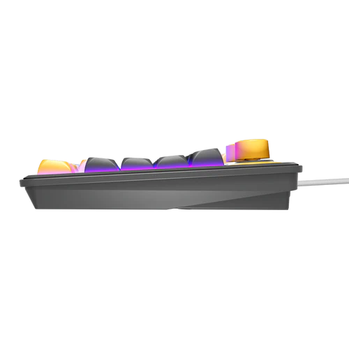 Tastiera ka një dizajn elegante me kombinim ngjyrash gri, e zezë dhe të verdhë që i jep një pamje sportive dhe moderne. Kompakte, e lehtë për t’u përdorur dhe e përshtatshme për çdo gamer apo përdorues që kërkon një tastierë funksionale dhe estetike.